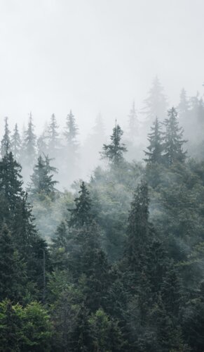 Une fraîcheur claire. Un brouillard froid flotte au-dessus de la pinède. Il se dissipe et fait place à de nouvelles perspectives. Des contours nets se dessinent. La vie s’enroule en colimaçon vers le ciel – son unique limite. Bois et métal, gris et brun, fraîcheur et chaleur : les contraires s’attirent et s’unissent.